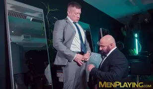 Suited Mark Vallant serves sloppy blowjob in an ass fucking with Bruce Beckham