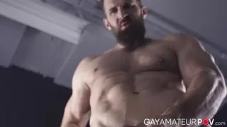Hairy hunk Chuck Conrad works his massive dick with his two hands after flexing his t