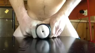 Description: Doing the manual rubdown the beef whistle begins drooling ginormous fountains of steamy jizz up on the table.