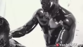 Description: Preparing for a wet, sticky scene, inked up Asian muscle daddy Damian Dragon and his tatted son Yoshi splatter a thick coat of oily black goo over their heads!