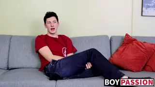Description: This skinny lad feels a huge need to toy with his thick cock after getting interviewed. He cums all over himself later.