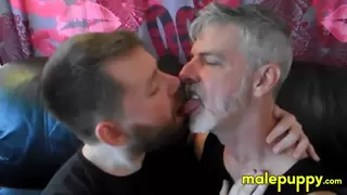 Gay bear cub Kaleb DeWulf has his smooth mouth open for kissing with Richard Lennox