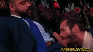 Description: Bearded hunk in a suit and tie has his massive hard shaft slobbered on after winning in a card game