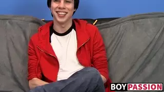 Description: Naughty interviewed twink Kyler moss solo jerking off his rock hard dick before doused himself in a massive jizz.