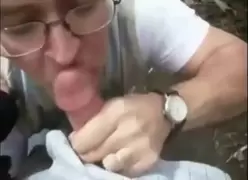 Description: Two men enjoy a passionate outdoor encounter, with one on his knees, eagerly sucking his partner's cock in the woods, moaning with pleasure as he tastes the cum.