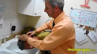 Description: Jeff doesn't like the idea at all and protests loudly, but once Richard holds his head under the warm running water, he loosens up.
