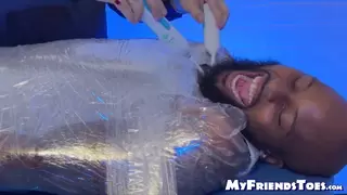 Shaved head Dallas was saran wrapped in a tickle torment by the master