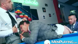 Suited men David Linset and Gustavo Cruz bareback with Steve Jouret