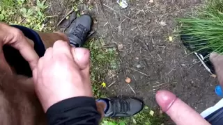 Description: Two horny men enjoy a steamy outdoor handjob session in the woods, stroking each other's cocks passionately, their desires igniting in the wild.