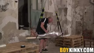 Description: Obedient twink is bound as his older master grabs his hard dick and strokes before making him cum.