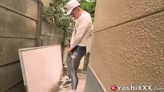 Yoshi Kawasaki jerks his bulge behind the fence and blasts his load