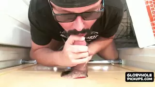 Description: Sex starved pervert found a glory hole room to have some fun with another deviant by sucking his prick..