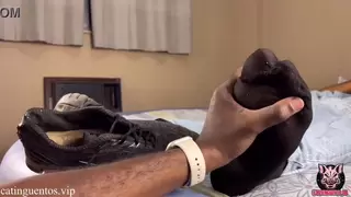 Lad wanks off his manmeat, pumps out spunk in messy odorous footwear, into white s...
