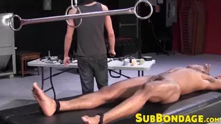 Description: Attractive ebony twink tied up to have his tight body whipped hardcore and racked for pleasure.