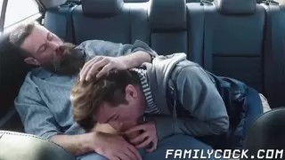 Bearded stepdad bare fucks his cute stepson on the backseat