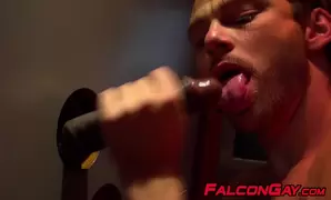 Description: Two horny muscular hunks blowing each others big fat dicks through glory hole until they both cum hard!